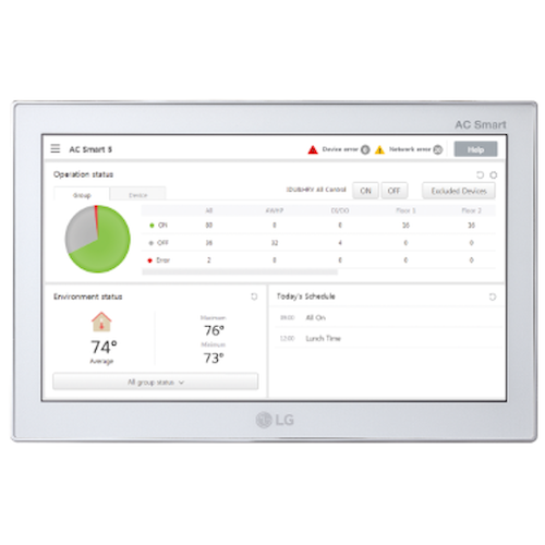 Ideal for office buildings, schools and other commercial applications, the Gateway’s AC Smart 5 controller is outfitted with a clear, 10.2-inch LCD touch-screen display and user-enabled web access, allowing the monitoring of LG HVAC and DOAS systems simple and convenient.